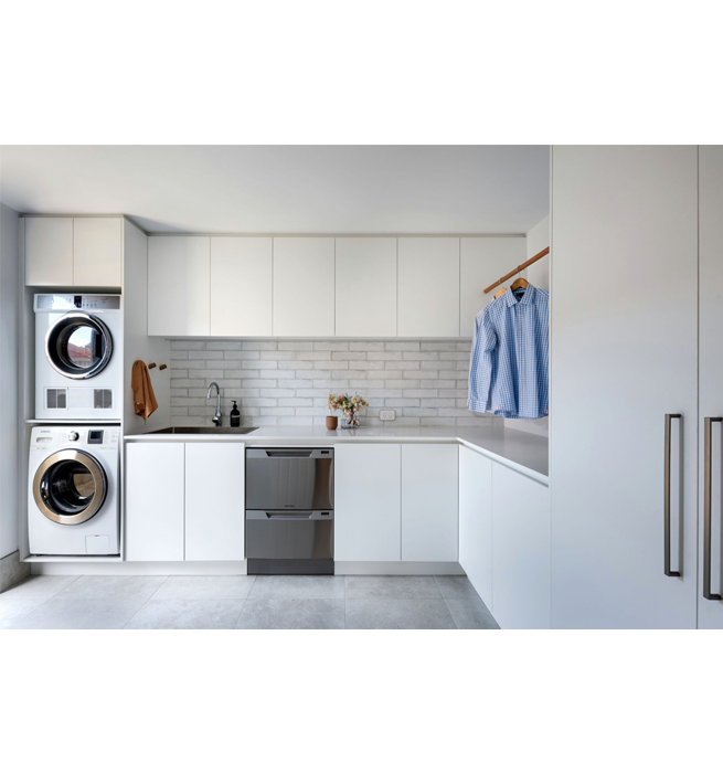 Optimise your floor plan with our streamlined laundry pods. Designed for maximum functionality in compact spaces, our laundry units come fully plumbed and wired with integrated cabinetry and moisture-resistant finishes. Whether it’s a compact laundry or a full-sized utility room, we deliver a high-end finish that eliminates the need for multiple on-site wet area trades.